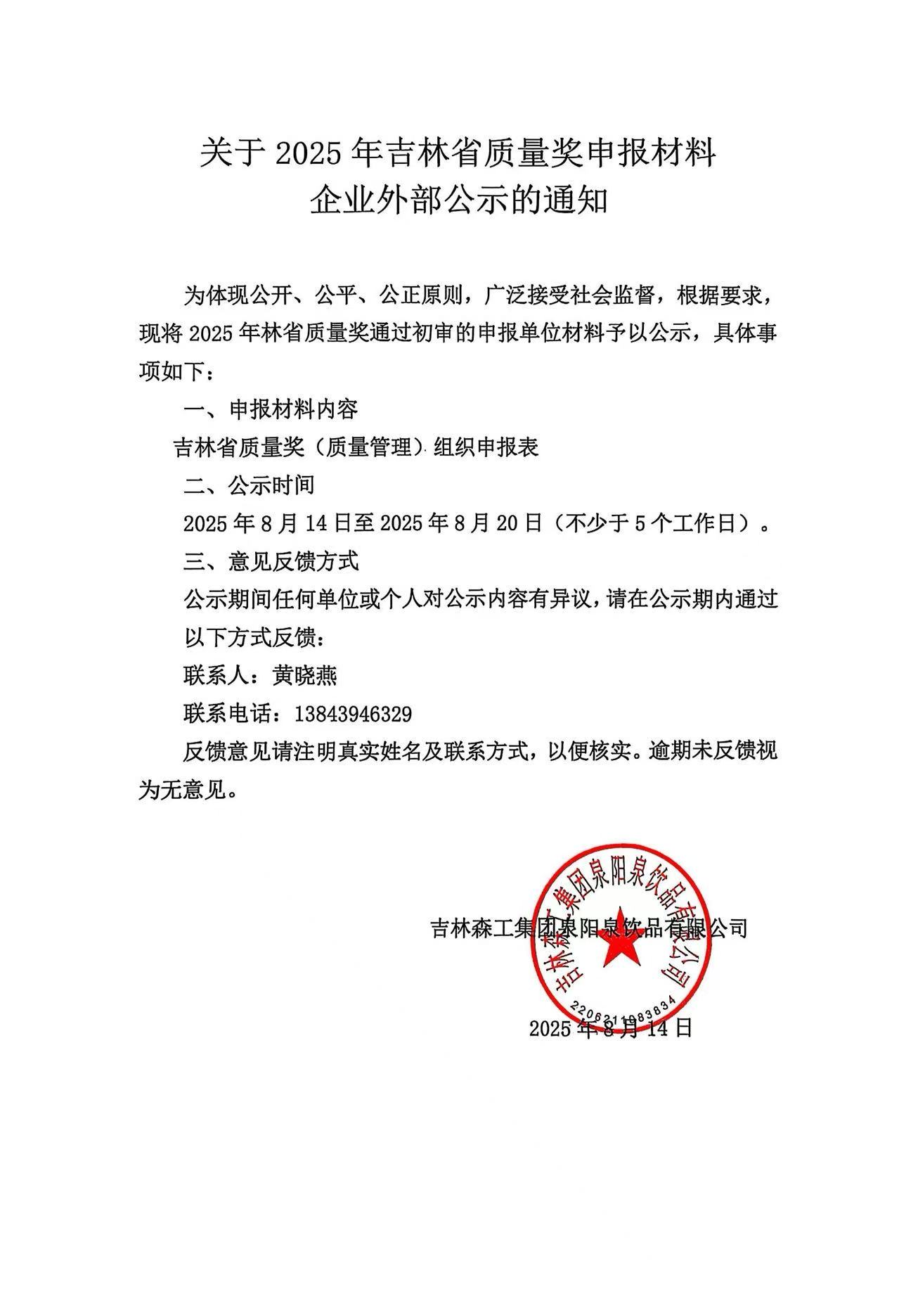 關于2025年吉林省質量獎申報材料企業(yè)外部公示的通知